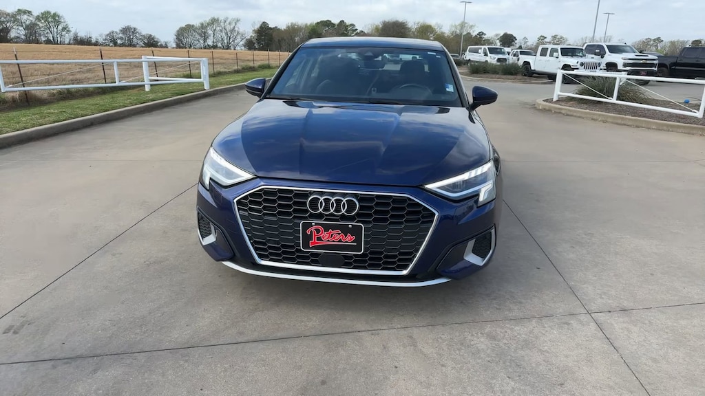 This 2024 Audi A3 FrontTrak in Blue comes with the following features: 2.0L 4-Cylinder TFSI 7-Speed Automatic S tronic FrontTrak 4-Wheel Disc Brakes, 6 Speakers, ABS brakes, Air Conditioning, Alloy wheels, AM/FM radio, Auto High-beam Headlights, Automatic temperature control, Brake assist, Bumpers: body-color, Delay-off headlights, Driver door bin, Driver vanity mirror, Dual front impact airbags, Dual front side impact airbags, Electronic Stability Control, Emergency communication system, Exterior Parking Camera Rear, Four wheel independent suspension, Front anti-roll bar, Front Bucket Seats, Front Center Armrest, Front dual zone A/C, Front reading lights, Fully automatic headlights, Heated door mirrors, Heated Front Bucket Seats, Heated front seats, Illuminated entry, Knee airbag, Leather Seating Surfaces, Leather steering wheel, Low tire pressure warning, Occupant sensing airbag, Outside temperature display, Overhead airbag, Overhead console, Panic alarm, Passenger door bin, Passenger vanity mirror, Power door mirrors, Power driver seat, Power moonroof, Power passenger seat, Power steering, Power windows, Radio data system, Radio: MMI w/10.1" Touchscreen Display, Rain sensing wipers, Rear air conditioning, Rear anti-roll bar, Rear fog lights, Rear reading lights, Rear seat center armrest, Rear side impact airbag, Rear window defroster, Remote keyless entry, Security system, Speed control, Speed-sensing steering, Speed-Sensitive Wipers, Split folding rear seat, Steering wheel mounted audio controls, Tachometer, Telescoping steering wheel, Tilt steering wheel, Traction control, Trip computer, Turn signal indicator mirrors, Variably intermittent wipers, and Wheels: 17" 5-Arm Design.