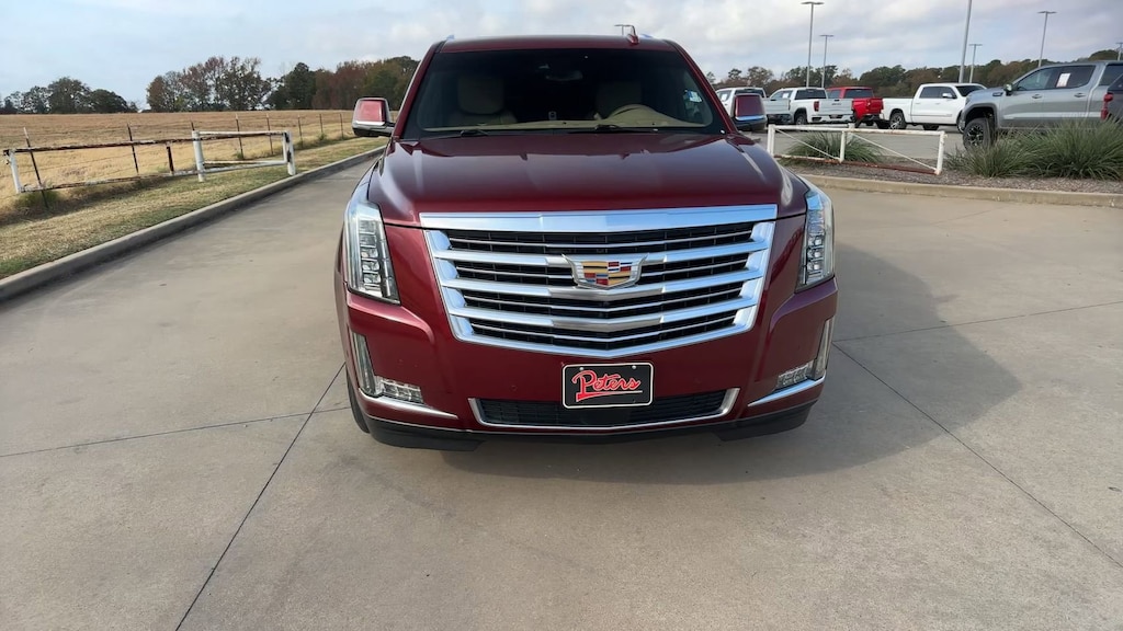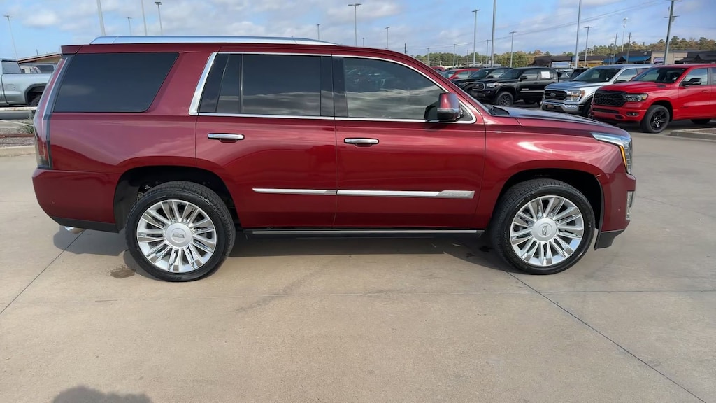 This 2019 Cadillac Escalade Platinum Edition in Red Passion Tintcoat comes with the following features: 6.2L V8 10-Speed Automatic with Overdrive RWD All-Weather Floor Liner Package (LPO), Driver Assist Package (Advanced Adaptive Cruise Control, Automatic Seat Belt Tightening, Electronic Powered Parking Brake, and Forward & Reverse Automatic Braking), Platinum Package (Cooled Console w/Covered Storage, Dual DVD Screens, Leather Wrapped IP/Console/Door, Microfiber Sueded Headliner, Platinum Sill Plates, Premium Floor Mats, Sumi Black Tamo Ash Unique Exotic Wood, and Unique Grille Design), Preferred Equipment Group 1SD (Forward Automatic Braking, Forward Collision Alert, Illuminated Door Handles, IntelliBeam Automatic High Beam On/Off, Lane Change Alert w/Side Blind Zone Alert, Lane Keep Assist w/Lane Departure Warning, Power Configurable Second Row Bucket Seats, Power Tilt-Sliding Sunroof w/Express-Open/Close, Power-Retractable Assist Steps, Rear Camera Mirror, Rear Camera Mirror Washer, Rear Cross Traffic Alert, Rear Seat Entertainment System, Reconfigurable 4-Color Head-Up Display, Safety Alert Seat, and VAC Power 17" Disc Brakes), Theft-Deterrent Package (Inclination Sensor, Theft-Deterrent Alarm System, and Vehicle Interior Movement Sensor), 12-Way Power Front Passenger Seat Adjuster, 16 Speakers, 2-Presets Memory For Driver Seat Adjuster, 3.23 Axle Ratio, 3rd row seats: split-bench, 4-Wheel Disc Brakes, A/V remote, ABS brakes, Adaptive suspension, Adjustable pedals, Air Conditioning, Alloy wheels, AM/FM radio: SiriusXM, Apple CarPlay/Android Auto, Auto High-beam Headlights, Auto tilt-away steering wheel, Auto-dimming door mirrors, Auto-leveling suspension, Automatic temperature control, Black Front License Plate Bracket, Black Integrated Roof Rack Rails (LPO), Bodyside moldings, Bose Centerpoint 16 Speaker Surround Sound System, Brake assist, Bumpers: body-color, CD player, Compass, Delay-off headlights, Driver door bin, Driver vanity mirror, Dual front impact airbags, Dual front side impact airbags, DVD-Audio, Electronic Stability Control, Emergency communication system: OnStar Protection, Exterior Parking Camera Rear, Front anti-roll bar, Front Bucket Seats, Front Center Armrest w/Storage, Front dual zone A/C, Front reading lights, Front wheel independent suspension, Fully automatic headlights, Garage door transmitter, Genuine wood dashboard insert, HD Radio, Headphones, Heads-Up Display, Heated & Cooled Driver & Front Passenger Seats, Heated door mirrors, Heated front seats, Heated rear seats, Heated steering wheel, Illuminated entry, Leather Shift Knob, Leather steering wheel, Low tire pressure warning, Magnetic Ride Control Suspension, Memory seat, Navigation System, Occupant sensing airbag, Outside temperature display, Overhead airbag, Overhead console, Panic alarm, Passenger door bin, Passenger vanity mirror, Pedal memory, Polished Exhaust Tip, Power door mirrors, Power driver seat, Power Liftgate, Power moonroof, Power passenger seat, Power steering, Power windows, Radio data system, Radio: AM/FM Cadillac User Experience w/Nav, Rain sensing wipers, Rear air conditioning, Rear anti-roll bar, Rear audio controls, Rear reading lights, Rear window defroster, Rear window wiper, Remote keyless entry, Roof rack: rails only, Security system, Semi-Aniline Leather Seating Surfaces, SiriusXM NavTraffic, SiriusXM Radio, Speed control, Split folding rear seat, Spoiler, Steering wheel memory, Steering wheel mounted audio controls, Tachometer, Telescoping steering wheel, Tilt steering wheel, Traction control, Trip computer, Turn signal indicator mirrors, Variably intermittent wipers, Ventilated front seats, and Wheels: 22" x 9" Dual 9-Spoke Alloy w/Chrome Inserts.