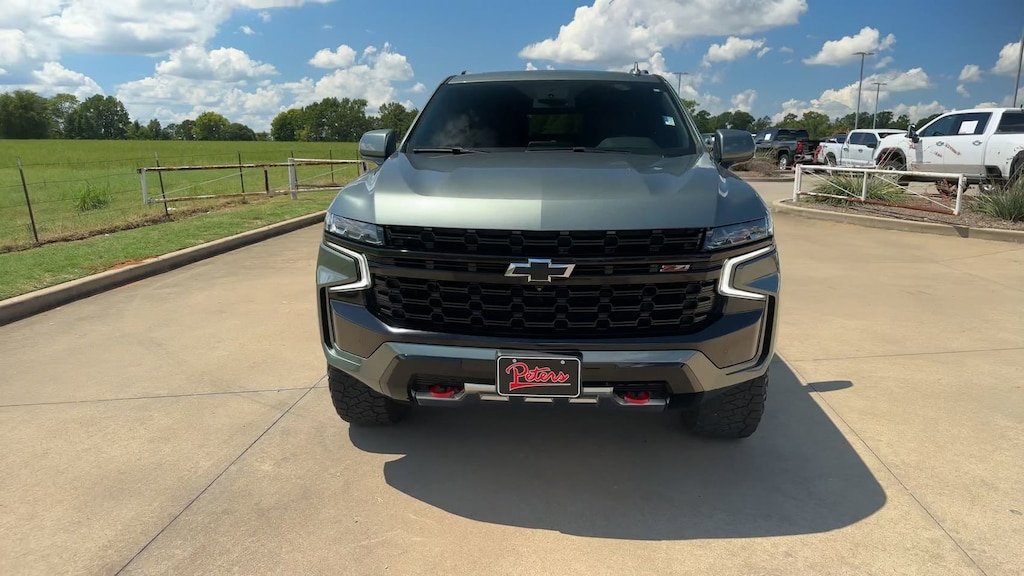 This 2023 Chevrolet Tahoe Z71 in Silver Sage Metallic comes with the following features: EcoTec3 5.3L V8 10-Speed Automatic with Overdrive 4WD Driver Alert Package (Lane Change Alert w/Side Blind Zone Alert and Rear Cross Traffic Alert), License Plate Front Mounting Package, Luxury Package (2nd Row Pwr Release 60/40 Split-Folding Bench Seat, 3rd Row 60/40 Power-Folding Split-Bench Seat, HD Surround Vision, Heated 2nd Row Outboard Seats, Heated Steering Wheel, Memory Settings, Outside Heated Power-Adjustable Mirrors, Power Tilt & Telescopic Steering Column, and Rear Pedestrian Alert), Preferred Equipment Group 2Z7 (1st & 2nd Row Color-Keyed Carpeted Floor Mats, 2-Speed Active Electronic AutoTrac Transfer Case, Auto-Dimming Inside Rear-View Mirror, Black Tubular Assist Steps, Bose 9-Speaker Stereo Audio System Feature, Bright Front & Rear Door Sill Plates, Color-Keyed Carpeting Floor Covering, Driver & Front Outboard Passenger Airbags, Enhanced Driver Information Center, Floor Console w/Storage Area, Front High-Approach Angle Fascia, Hands-Free Rear Power Programmable Liftgate, Hill Descent Control, Infotainment Display, LED Daytime Running Lamps, Memory Settings for Driver, Red Horizontal-Mounted Recovery Hooks, Remote Start, SiriusXM Radio w/360L, Universal Home Remote, Wireless Charging, and Wrapped Steering Wheel), 4WD, Black Leather, 10-Way Power Driver & Passenger Seat Adjusters, 1st, 2nd & 3rd Rows All-Weather Floor Liners (LPO), 3.23 Rear Axle Ratio, 3rd row seats: split-bench, 4-Wheel Disc Brakes, 9 Speakers, ABS brakes, Air Conditioning, Alloy wheels, AM/FM radio: SiriusXM with 360L, Apple CarPlay/Android Auto, Auto High-beam Headlights, Auto-dimming Rear-View mirror, Automatic temperature control, Brake assist, Bumpers: body-color, Compass, Delay-off headlights, Driver door bin, Driver vanity mirror, Dual front impact airbags, Dual front side impact airbags, Dual-Pane Power Panoramic Sunroof, Electronic Stability Control, Emergency communication system: OnStar and Chevrolet connected services capable, Four wheel independent suspension, Front anti-roll bar, Front Bucket Seats, Front Center Armrest, Front dual zone A/C, Front High-Back Reclining Bucket Seats, Front reading lights, Fully automatic headlights, Garage door transmitter, Heated door mirrors, Heated Driver & Front Passenger Seats, Heated front seats, Illuminated entry, Leather-Appointed Seat Trim, Low tire pressure warning, Memory seat, Navigation System, Occupant sensing airbag, Outside temperature display, Overhead airbag, Overhead console, Panic alarm, Passenger door bin, Passenger vanity mirror, Power door mirrors, Power driver seat, Power Liftgate, Power passenger seat, Power steering, Power windows, Premium audio system: Chevrolet Infotainment 3 Premium, Premium Smooth Ride Suspension, Radio: Chevrolet Infotainment 3 Premium System, Rain sensing wipers, Rear air conditioning, Rear anti-roll bar, Rear reading lights, Rear seat center armrest, Rear window defroster, Rear window wiper, Remote keyless entry, Roof rack: rails only, Security system, Speed control, Speed-sensing steering, Split folding rear seat, Spoiler, Steering wheel mounted audio controls, Tachometer, Telescoping steering wheel, Tilt steering wheel, Traction control, Trip computer, Variably intermittent wipers, Voltmeter, and Wheels: 20" x 9" Machined Aluminum.