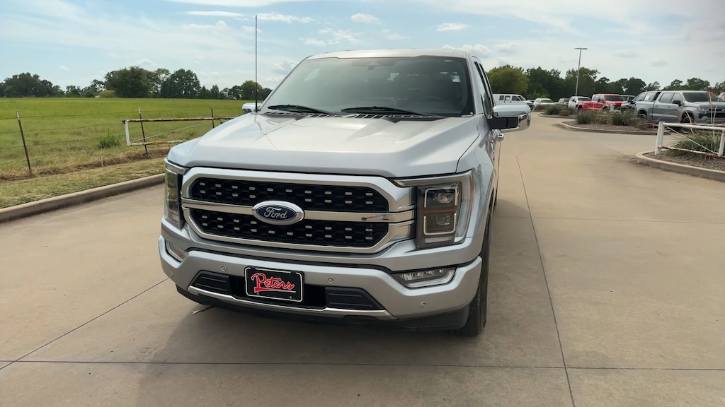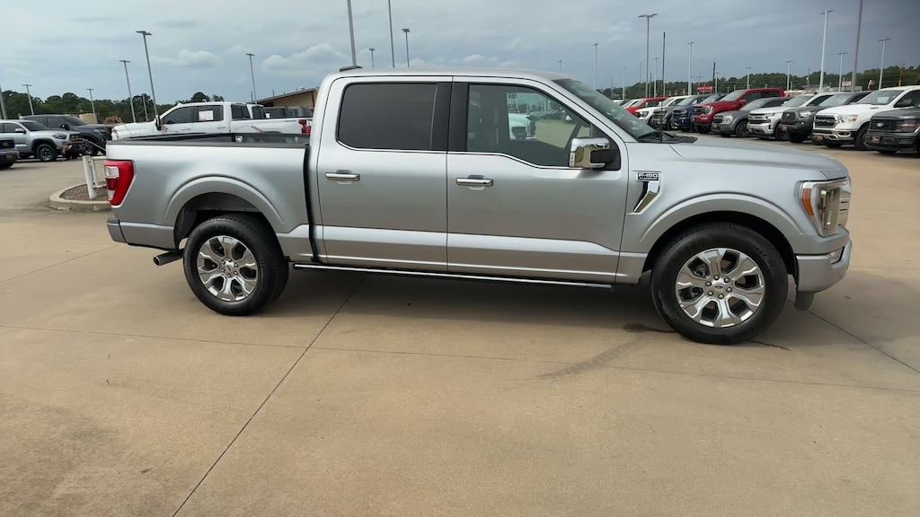 This 2023 Ford F-150 Platinum in Iconic Silver Metallic comes with the following features: 3.5L V6 EcoBoost 10-Speed Automatic RWD Equipment Group 700A Standard, F-150 Platinum, 4D SuperCrew, 3.5L V6 EcoBoost, 10-Speed Automatic, RWD, Iconic Silver Metallic, Black w/Baja Tan w/Leather-Trimmed Bucket Seats, Exterior Parking Camera Rear, 4-Wheel Disc Brakes, ABS brakes, Air Conditioning, Auto High-beam Headlights, Brake assist, Compass, Delay-off headlights, Driver door bin, Dual front impact airbags, Dual front side impact airbags, Electronic Stability Control, Emergency communication system: SYNC 4 911 Assist, Front anti-roll bar, Front reading lights, Front wheel independent suspension, Fully automatic headlights, Heated door mirrors, Illuminated entry, Low tire pressure warning, Occupant sensing airbag, Outside temperature display, Overhead airbag, Overhead console, Panic alarm, Passenger door bin, Passenger vanity mirror, Power door mirrors, Power steering, Power windows, Radio data system, Rear step bumper, Remote keyless entry, Security system, Speed control, Speed-sensing steering, Split folding rear seat, Steering wheel mounted audio controls, Tachometer, Telescoping steering wheel, Tilt steering wheel, Traction control, Trip computer, Variably intermittent wipers, and Voltmeter.