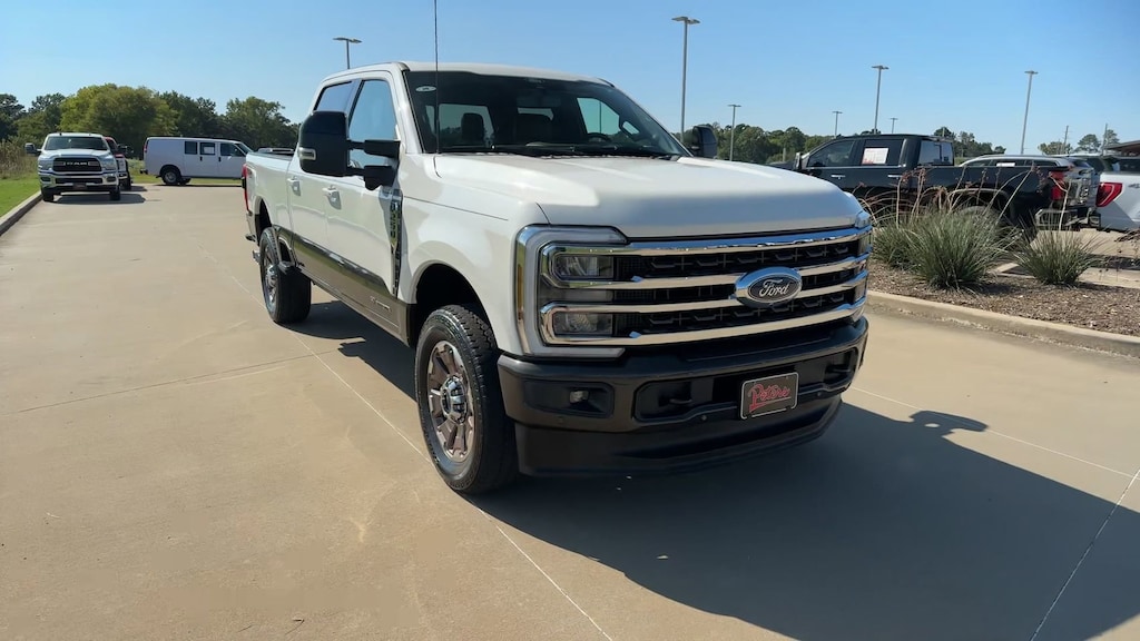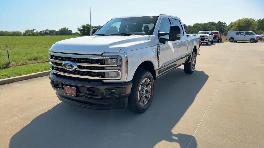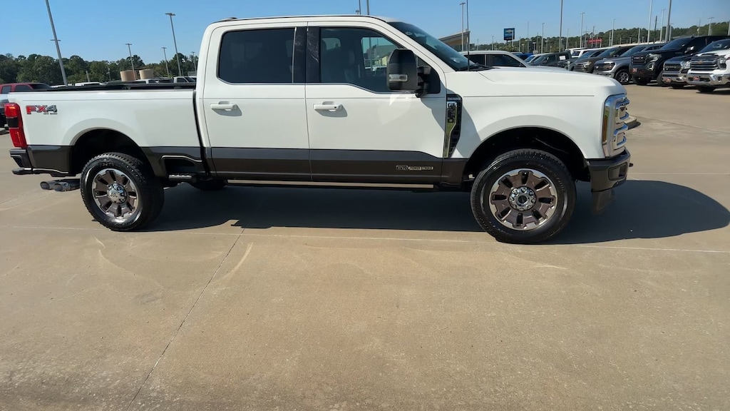 This 2024 Ford F-250SD King Ranch in Star White Metallic Tri-Coat comes with the following features: Power Stroke 6.7L V8 DI 32V OHV Turbodiesel 10-Speed Automatic 4WD F-250 >10K GVWR Package, FX4 Off-Road Package (Hill Descent Control, Off-Road Specifically Tuned Shock Absorbers, and Unique FX4 Off-Road Box Decal), 4WD, 3.73 Axle Ratio, 4-Wheel Disc Brakes, ABS brakes, Adjustable pedals, Air Conditioning, Alloy wheels, AM/FM radio: SiriusXM with 360L, Auto High-beam Headlights, Auto tilt-away steering wheel, Auto-dimming Rear-View mirror, Automatic temperature control, Brake assist, Compass, Delay-off headlights, Driver door bin, Driver vanity mirror, Dual front impact airbags, Dual front side impact airbags, Electronic Stability Control, Electronic-Locking w/3.31 Axle Ratio, Emergency communication system: SYNC 4 911 Assist, Engine Block Heater, Exterior Parking Camera Rear, Flow-Through Console, Front anti-roll bar, Front Bucket Seats, Front Center Armrest, Front dual zone A/C, Front fog lights, Front reading lights, Fully automatic headlights, Garage door transmitter, Heated door mirrors, Heated front seats, Heated rear seats, Heated steering wheel, Illuminated entry, Leather steering wheel, Low tire pressure warning, Memory seat, Navigation system: Connected Navigation (includes complimentary 1-year trial), Outside temperature display, Overhead airbag, Overhead console, Panic alarm, Passenger door bin, Passenger vanity mirror, Pedal memory, Power door mirrors, Power driver seat, Power passenger seat, Power steering, Power windows, Radio: B&O Unleashed Sound System by Bang & Olufsen, Rain sensing wipers, Rear reading lights, Rear seat center armrest, Rear step bumper, Rear window defroster, Remote keyless entry, Security system, SiriusXM Radio w/360L, Speed control, Split folding rear seat, Steering wheel memory, Steering wheel mounted audio controls, SYNC 4 w/Enhanced Voice Recognition, Tachometer, Telescoping steering wheel, Tilt steering wheel, Tough Bed Spray-In Bedliner, Traction control, Trip computer, Turn signal indicator mirrors, Twin Panel Power Moonroof, Variably intermittent wipers, and Ventilated front seats.