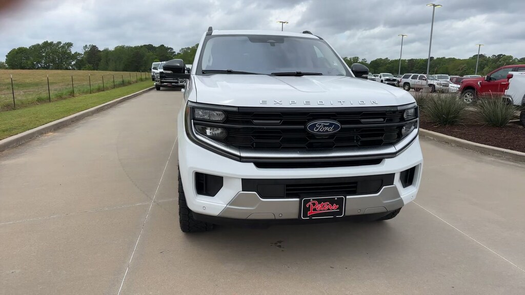 This 2025 Ford Expedition Max Platinum in Oxford White comes with the following features: EcoBoost 3.5L V6 GTDi DOHC 24V Twin Turbocharged 10-Speed Automatic 4WD Equipment Group 600A Standard Package (2nd Row Power-Folding Captain's Chairs), 10 Speakers, 3.73 Axle Ratio, 3rd row seats: split-bench, 4-Wheel Disc Brakes, ABS brakes, Adjustable pedals, Air Conditioning, Alloy wheels, AM/FM radio: SiriusXM with 360L, Apple CarPlay/Android Auto, Auto High-beam Headlights, Auto-dimming door mirrors, Auto-dimming Rear-View mirror, Automatic temperature control, Brake assist, Bumpers: body-color, Compass, Delay-off headlights, Driver door bin, Driver vanity mirror, Dual front impact airbags, Dual front side impact airbags, Electronic Stability Control, Emergency communication system: 911 Assist, Exterior Parking Camera Rear, Four wheel independent suspension, Front anti-roll bar, Front Bucket Seats, Front Center Armrest, Front dual zone A/C, Front License Plate Bracket, Front reading lights, Fully automatic headlights, Garage door transmitter, Genuine wood dashboard insert, Genuine wood door panel insert, Heated & Ventilated Leather Front Captain's Chairs, Heated door mirrors, Heated front seats, Heated rear seats, Heated steering wheel, Illuminated entry, Leather steering wheel, Low tire pressure warning, Memory seat, Navigation System, Occupant sensing airbag, Outside temperature display, Overhead airbag, Overhead console, Panic alarm, Passenger door bin, Passenger vanity mirror, Pedal memory, Power door mirrors, Power driver seat, Power moonroof: Vista Roof, Power passenger seat, Power steering, Power windows, Radio data system, Radio: B&O Sound System by Bang & Olufsen, Rain sensing wipers, Rear air conditioning, Rear anti-roll bar, Rear reading lights, Rear window defroster, Rear window wiper, Reclining 3rd row seat, Remote keyless entry, Security system, SiriusXM w/360L, Speed control, Speed-sensing steering, Speed-Sensitive Wipers, Split folding rear seat, Spoiler, Steering wheel memory, Steering wheel mounted audio controls, Tachometer, Telescoping steering wheel, Tilt steering wheel, Traction control, Trip computer, Turn signal indicator mirrors, Variably intermittent wipers, Ventilated front seats, Voltmeter, and Wheels: 20" Ebony Bright Machined Aluminum.