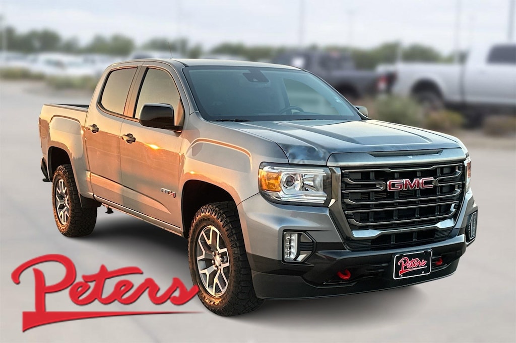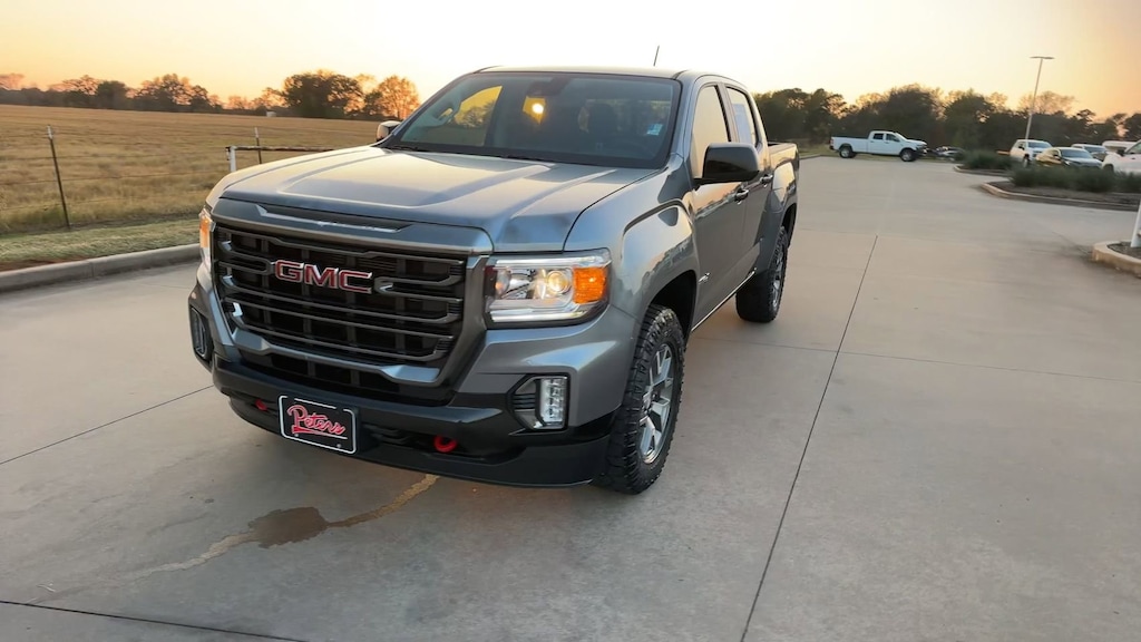 This 2021 GMC Canyon AT4 w/Leather in Satin Steel Metallic comes with the following features: V6 8-Speed Automatic 4WD Driver Alert Package (Forward Collision Alert and Lane Departure Warning System), Preferred Equipment Group 4SB (Hitch Guidance and Tow/Haul Mode), Trailering Package, 2 USB Data Ports, 3.42 Rear Axle Ratio, 4-Way Power Front Passenger Seat Adjuster, 4-Wheel Disc Brakes, 6 Speakers, 6-Speaker Audio System Feature, ABS brakes, Air Conditioning, Alloy wheels, AM/FM radio: SiriusXM with 360L, Apple CarPlay/Android Auto, Auto-dimming Rear-View mirror, Automatic temperature control, Bose Premium 7-Speaker Audio System Feature, Bumpers: body-color, Compass, Delay-off headlights, Driver 6-Way Power Seat Adjuster, Driver door bin, Driver Instrument Information Enhanced Display, Driver vanity mirror, Dual front impact airbags, Dual front side impact airbags, Electronic Stability Control, Exterior Parking Camera Rear, Front anti-roll bar, Front Bucket Seats, Front Center Armrest, Front fog lights, Front License Plate Kit, Front reading lights, Front wheel independent suspension, Fully automatic headlights, HD Radio, Heated door mirrors, Heated Driver & Front Passenger Seats, Heated front seats, Heated Steering Wheel, Heated steering wheel, Illuminated entry, Leather-Appointed Seat Trim, Low tire pressure warning, Occupant sensing airbag, Outside temperature display, Overhead airbag, Overhead console, Panic alarm, Passenger door bin, Passenger vanity mirror, Power door mirrors, Power Driver Lumbar Control Seat Adjuster, Power driver seat, Power Passenger Lumbar Control Seat Adjuster, Power passenger seat, Power steering, Power windows, Premium audio system: GMC Infotainment System, Radio data system, Radio: AM/FM w/8" Diagonal Multi-Touch Display, Radio: AM/FM w/8" Diagonal Multi-Touch Display Nav, Rear reading lights, Rear seat center armrest, Rear step bumper, Rear window defroster, Remote keyless entry, Security system, SiriusXM Radio, Speed control, Speed-sensing steering, Steering wheel mounted audio controls, Tachometer, Telescoping steering wheel, Tilt steering wheel, Traction control, Trip computer, Ultrasonic Rear Parking Assist, Variably intermittent wipers, and Wheels: 17" x 8" Dark Argent Metallic.