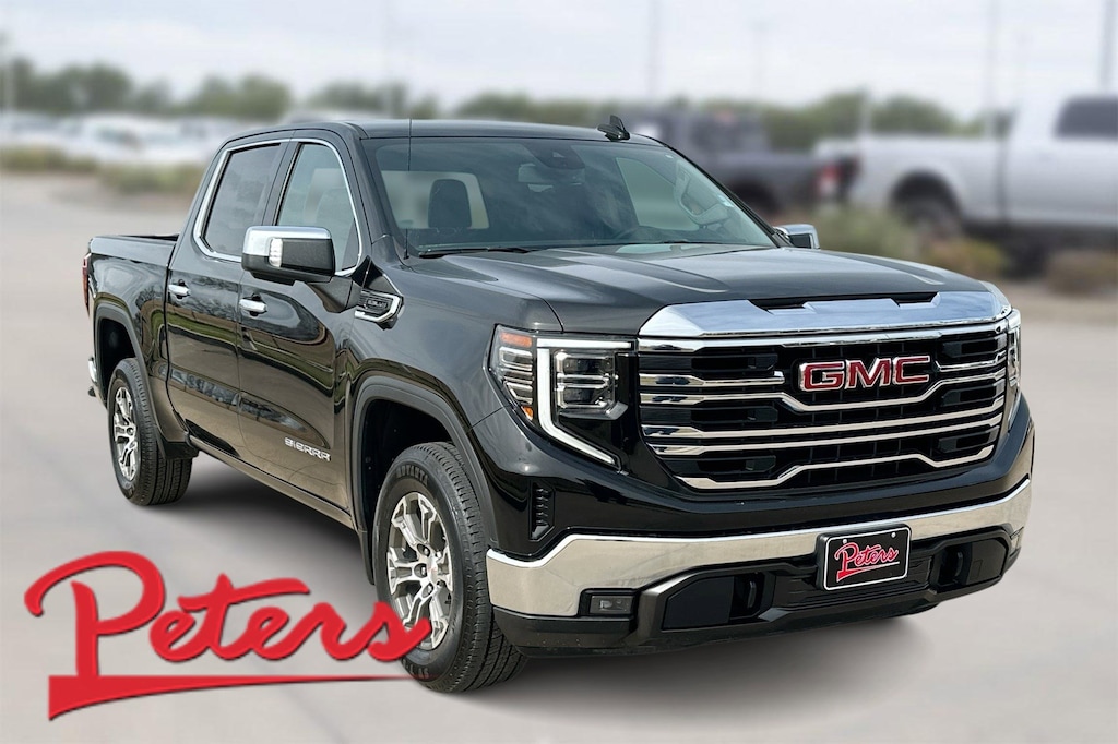 This 2025 GMC Sierra 1500 SLT in Onyx Black comes with the following features: EcoTec3 5.3L V8 10-Speed Automatic RWD Preferred Equipment Group 4SA (120-Volt Bed Mounted Power Outlet, 120-Volt Interior Power Outlet, 170 Amp Alternator, 2 Charge/Data USB Ports, 2 Type-C Charge-Only Rear USB Ports, 6-Speaker Audio System Feature, Auto-Locking Rear Differential, Auxiliary External Transmission Oil Cooler, Chrome Header & Chrome Grille Insert Bars, Color-Keyed Carpeting Floor Covering, Deep-Tinted Glass, Electric Rear-Window Defogger, Front Frame-Mounted Black Recovery Hooks, Front Rain-Sensing Wipers, HD Rear Vision Camera, Integrated Trailer Brake Controller, Keyless Open & Start, LED Cargo Area Lighting, Manual Tilt-Wheel & Telescoping Steering Column, OnStar Services Capable, Perimeter Lighting, Power Door Locks, Power Front Passenger Windows w/Express Up/Down, Power Front Windows w/Driver Express Up/Down, Power Rear Windows w/Express Down, Push Button Start, Rear Wheelhouse Liners, Remote Vehicle Starter System, SiriusXM w/360L Trial Subscription, Steering Wheel Audio Controls, Theft Deterrent System (Unauthorized Entry), and Wi-Fi Hotspot Capable), Standard Suspension Package, Trailering Package (Hitch Guidance), 10-Way Power Driver Seat Adjuster w/Lumbar, 10-Way Power Passenger Seat Adjuster w/Lumbar, 3.23 Rear Axle Ratio, 4-Wheel Disc Brakes, 6 Speakers, ABS brakes, Air Conditioning, Alloy wheels, AM/FM radio: SiriusXM with 360L, Apple CarPlay/Android Auto, Auto High-beam Headlights, Auto-dimming door mirrors, Auto-dimming Rear-View mirror, Automatic Emergency Braking, Automatic temperature control, Brake assist, Buckle to Drive, Bumpers: chrome, Compass, Delay-off headlights, Driver door bin, Driver Memory, Driver vanity mirror, Dual front impact airbags, Dual front side impact airbags, Electronic Stability Control, Emergency communication system: OnStar, Following Distance Indicator, Forward Collision Alert, Front 40/20/40 Split-Bench Seat, Front anti-roll bar, Front Center Armrest w/Storage, Front dual zone A/C, Front fog lights, Front License Plate Kit, Front Pedestrian Braking, Front reading lights, Front wheel independent suspension, Fully automatic headlights, Heated door mirrors, Heated Driver & Front Outboard Passenger Seating, Heated front seats, Heated steering wheel, Illuminated entry, IntelliBeam Automatic High Beam On/Off, Lane Keep Assist w/Lane Departure Warning, Low tire pressure warning, Memory seat, Navigation System, Occupant sensing airbag, Outside temperature display, Overhead airbag, Overhead console, Panic alarm, Passenger door bin, Passenger vanity mirror, Perf Leather-Appointed Front Outboard Seat Trim, Power door mirrors, Power driver seat, Power passenger seat, Power steering, Power windows, Radio data system, Radio: Premium GMC Infotainment Audio System, Rain sensing wipers, Rear reading lights, Rear seat center armrest, Rear step bumper, Rear window defroster, Remote keyless entry, Security system, Speed control, Speed-sensing steering, Split folding rear seat, Steering wheel mounted audio controls, Tachometer, Telescoping steering wheel, Tilt steering wheel, Traction control, Trip computer, Variably intermittent wipers, Voltmeter, Wheels: 18" x 8.5" 6-Spoke Machined Aluminum, and Wireless Apple CarPlay/Wireless Android Auto.