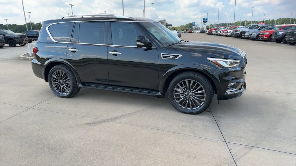 This 2024 INFINITI QX80 Premium Select in Mineral Black comes with the following features: 5.6L V8 7-Speed Automatic RWD All-Season Package (All-Season Floor Mats and Cargo Area Mat), Cargo Package (Console Net, First-Aid Kit, Moisture-Resistant Rear Cargo Carpet, and Nylon-Cord Cargo Net), 13 Speakers, 2.937 Axle Ratio, 3rd row seats: bench, 4-Wheel Disc Brakes, ABS brakes, Air Conditioning, Alloy wheels, AM/FM radio: SiriusXM, Anti-whiplash front head restraints, Apple CarPlay/Android Auto, Auto High-beam Headlights, Auto tilt-away steering wheel, Auto-dimming door mirrors, Auto-dimming Rear-View mirror, Auto-leveling suspension, Automatic temperature control, Brake assist, Bumpers: body-color, Compass, Delay-off headlights, Driver door bin, Driver vanity mirror, Dual Camera Drive Recorder Dash Cam, Dual front impact airbags, Dual front side impact airbags, Electronic Stability Control, Emergency communication system: INFINITI InTouch, Four wheel independent suspension, Front anti-roll bar, Front Bucket Seats, Front Center Armrest, Front dual zone A/C, Front fog lights, Front reading lights, Fully automatic headlights, Garage door transmitter: HomeLink, Heated door mirrors, Heated Front Bucket Seats, Heated front seats, Heated steering wheel, Illuminated entry, INFINITI Radiant Illuminated Cargo Scuff Plates, INFINITI Radiant Welcome Lighting, Leather Shift Knob, Leather steering wheel, Leather-Appointed Seats, Literature Kit, Low tire pressure warning, Memory seat, Navigation system: INFINITI InTouch Navigation, Occupant sensing airbag, Outside temperature display, Overhead airbag, Overhead console, Panic alarm, Passenger door bin, Passenger vanity mirror, Power door mirrors, Power driver seat, Power Liftgate, Power moonroof, Power passenger seat, Power steering, Power windows, Premium Select Truffle Brown Interior, Radio data system, Radio: Bose Premium Audio System w/13 Speakers, Rain sensing wipers, Rear air conditioning, Rear anti-roll bar, Rear reading lights, Rear seat center armrest, Rear window defroster, Rear window wiper, Reclining 3rd row seat, Remote keyless entry, Roof Rail Cross Bars, Security system, Speed control, Speed-sensing steering, Split folding rear seat, Spoiler, Steering wheel memory, Steering wheel mounted audio controls, Tachometer, Telescoping steering wheel, Tilt steering wheel, Traction control, Trip computer, Turn signal indicator mirrors, USB Charging Cable Set, Variably intermittent wipers, Voltmeter, and Wheels: 22" Dark Chrome Cast Aluminum-Alloy.