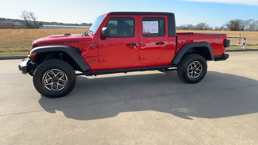 This 2024 Jeep Gladiator Rubicon in Firecracker Red Clearcoat comes with the following features: 3.6L V6 24V VVT 8-Speed Automatic 4WD Convenience Group (Emergency/Assistance Call, Heated Front Seats, Heated Steering Wheel, Remote Start System, SiriusXM Radio Service, SiriusXM w/360L, and Universal Garage Door Opener), Quick Order Package 24R Rubicon, Safety Group (Auto High Beam Headlamp Control, Blind Spot & Cross Path Detection, and ParkSense Rear Park Assist System), 12.3" Touchscreen Display, 4-Wheel Disc Brakes, 4.10 Rear Axle Ratio, 4G LTE Wi-Fi Hot Spot, 8 Speakers, 97 MPH Vehicle Max Speed Calibration, ABS brakes, Air Conditioning, Alexa Built-In, Alloy wheels, AM/FM radio: SiriusXM with 360L, Apple CarPlay, Apple CarPlay/Android Auto, Automatic temperature control, Black 3-Piece Hard Top, Brake assist, Cloth Low-Back Bucket Seats, Compass, Connectivity - US/Canada, Delay-off headlights, Driver door bin, Driver vanity mirror, Dual front impact airbags, Dual front side impact airbags, Electronic Stability Control, Emergency communication system: Jeep Connect, Freedom Panel Storage Bag, Front anti-roll bar, Front Bucket Seats, Front Center Armrest w/Storage, Front dual zone A/C, Front fog lights, Front reading lights, Fully automatic headlights, Google Android Auto, Heated door mirrors, Illuminated entry, Integrated Center Stack Radio, Integrated roll-over protection, Low tire pressure warning, MOPAR All-Weather Slush Mats, MOPAR Hardtop Headliner, Occupant sensing airbag, Outside temperature display, Overhead airbag, Panic alarm, Passenger door bin, Passenger vanity mirror, Performance Suspension, Power door mirrors, Power steering, Power windows, Radio data system, Radio: Uconnect 5 w/12.3" Display, Rear anti-roll bar, Rear reading lights, Rear Sliding Window, Rear Window Defroster, Remote keyless entry, Security system, Speed control, Split folding rear seat, Steering wheel mounted audio controls, Tachometer, Telescoping steering wheel, Tilt steering wheel, Traction control, Trip computer, USB Host Flip, Variably intermittent wipers, Voltmeter, and Wheels: 17" x 7.5" Machined/Painted Black.