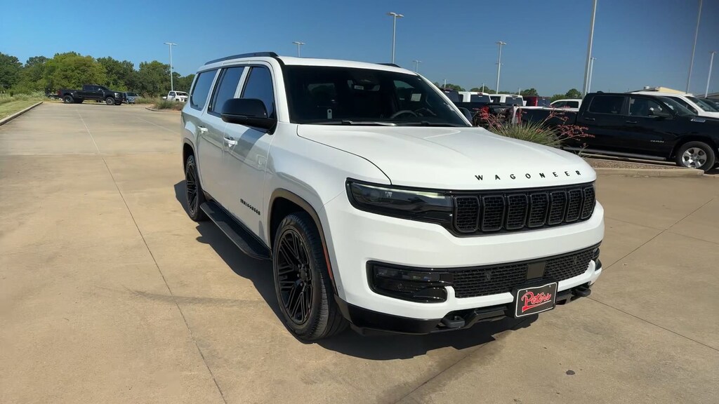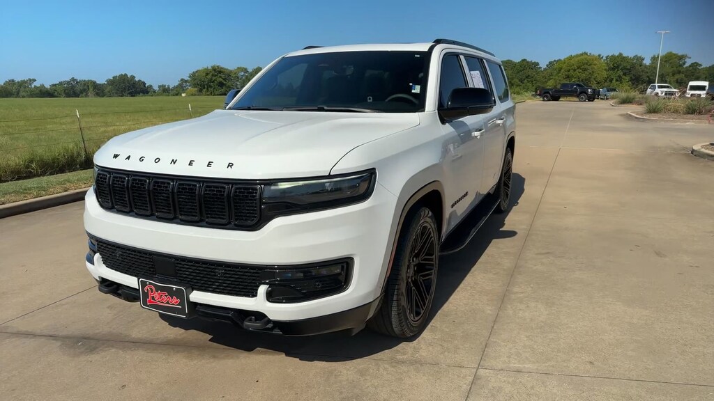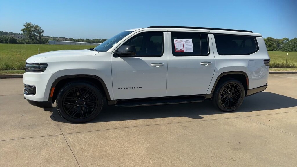 This 2024 Jeep Wagoneer L Series II in Bright White Clearcoat comes with the following features: 3.0L I6 8-Speed Automatic 4WD Carbide Appearance Package, Flexible Seating Group (40/20/40 2nd Row Bench Power Tip/Slide, 8-Passenger Seating, and Full Length Floor Console), HD Trailer Tow Package (2 Speed On Demand Transfer Case, 3.92 Rear Axle Ratio, Electronic Rear Limited Slip Differential, Heavy-Duty Engine Cooling, Removable Rear Tow Hook, Selec-Speed Control, Trailer Brake Control, and Trailer Hitch Zoom), Quick Order Package 25F Carbide (3 Panel Sunroof, Adjustable Roof Rail Crossbars, Black Interior Accents, Piano Black Exterior Accents, Reversible Carpet/Vinyl Cargo Mat, and Wheels: 20" x 9.0" Aluminum Painted Gloss Black), Rear Seat Video Group 1 (DISC) (Amazon Fire TV Built-In, Seatback Video Screens, and Video USB Port), FCA US LLC Certified Pre-Owned Certified, 10 Speakers, 3.55 Rear Axle Ratio, 3rd row seats: bench, 4-Wheel Disc Brakes, ABS brakes, Adjustable pedals, Air Conditioning, Alloy wheels, AM/FM radio: SiriusXM with 360L, Anti-whiplash front head restraints, Apple CarPlay/Android Auto, Audio memory, Auto-dimming door mirrors, Auto-dimming Rear-View mirror, Auto-leveling suspension, Automatic temperature control, Brake assist, Bumpers: body-color, Compass, Delay-off headlights, Driver door bin, Driver vanity mirror, Driver's Seat Mounted Armrest, Dual front impact airbags, Dual front side impact airbags, Electronic Stability Control, Emergency communication system: Wagoneer Connect, Exterior Parking Camera Rear, Four wheel independent suspension, Front anti-roll bar, Front Bucket Seats, Front Center Armrest w/Storage, Front dual zone A/C, Front fog lights, Front reading lights, Fully automatic headlights, Garage door transmitter, Genuine wood console insert, Genuine wood dashboard insert, Genuine wood door panel insert, Heated door mirrors, Heated front seats, Heated steering wheel, Illuminated entry, Knee airbag, Leather Trimmed Bucket Seats, Low tire pressure warning, Memory seat, Navigation System, Normal Duty Suspension, Occupant sensing airbag, Outside temperature display, Overhead airbag, Overhead console, Panic alarm, Passenger door bin, Passenger seat mounted armrest, Passenger vanity mirror, Pedal memory, Power adjustable front head restraints, Power door mirrors, Power driver seat, Power Liftgate, Power passenger seat, Power steering, Power windows, Radio data system, Radio: Uconnect 5 Nav w/10.1" Display, Rain sensing wipers, Rear air conditioning, Rear anti-roll bar, Rear reading lights, Rear seat center armrest, Rear window defroster, Rear window wiper, Reclining 3rd row seat, Remote keyless entry, Security system, Speed control, Speed-sensing steering, Speed-Sensitive Wipers, Split folding rear seat, Steering wheel memory, Steering wheel mounted audio controls, Tachometer, Telescoping steering wheel, Tilt steering wheel, Traction control, Trip computer, Turn signal indicator mirrors, Variably intermittent wipers, Ventilated front seats, Voltmeter, Wheels: 20" x 9.0" Premium 2 Aluminum, and Wheels: 22" x 9.0" Painted Gloss Black.