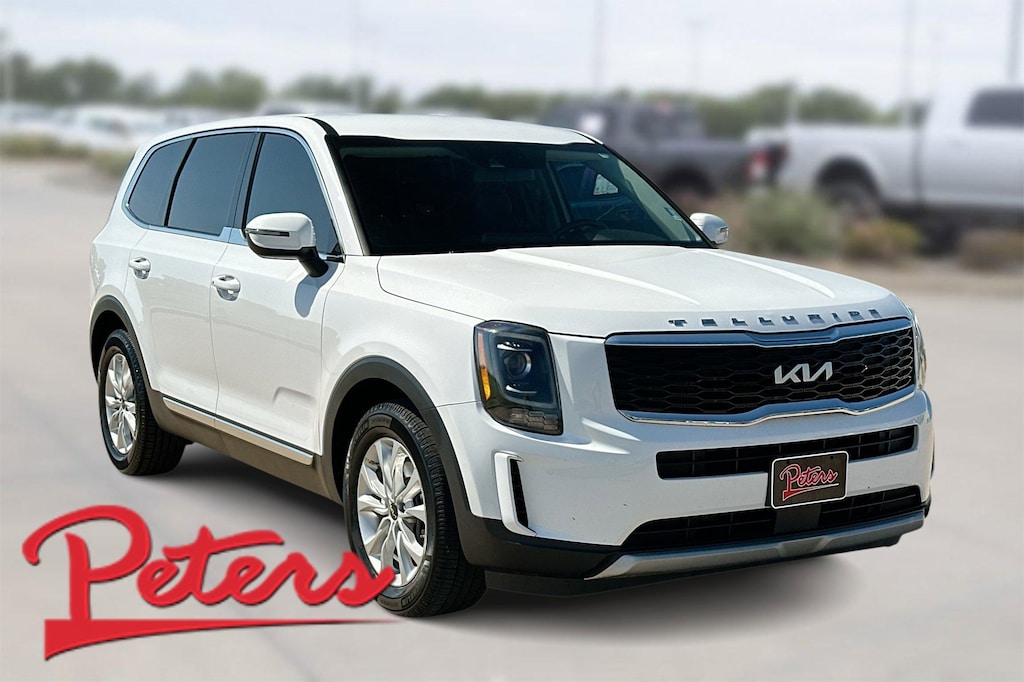 This 2022 Kia Telluride LX in Glacial White Pearl comes with the following features: 3.8L V6 DOHC 8-Speed Automatic AWD 3.648 Axle Ratio, 3rd row seats: split-bench, 4-Wheel Disc Brakes, 6 Speakers, ABS brakes, Air Conditioning, Alloy wheels, AM/FM radio: SiriusXM, Apple CarPlay & Android Auto, Automatic temperature control, Brake assist, Bumpers: body-color, Cargo Cover, Carpeted Floor Mats, Delay-off headlights, Driver door bin, Driver vanity mirror, Dual front impact airbags, Dual front side impact airbags, Electronic Stability Control, Emergency communication system: 911 Connect, Four wheel independent suspension, Front anti-roll bar, Front Bucket Seats, Front Center Armrest, Front dual zone A/C, Front reading lights, Fully automatic headlights, Heated door mirrors, Hybrid Cargo Net, Illuminated entry, Knee airbag, Leather steering wheel, Low tire pressure warning, Navigation System, Occupant sensing airbag, Outside temperature display, Overhead airbag, Overhead console, Panic alarm, Passenger door bin, Passenger vanity mirror, Power door mirrors, Power steering, Power windows, Radio data system, Radio: AM/FM Display Audio System, Rear air conditioning, Rear anti-roll bar, Rear audio controls, Rear reading lights, Rear seat center armrest, Rear window defroster, Rear window wiper, Reclining 3rd row seat, Remote keyless entry, Security system, Smart Key w/ Push Button and Remote Start, Speed control, Speed-sensing steering, Split folding rear seat, Spoiler, Steering wheel mounted audio controls, Synthetic Leather Seat Trim, Tachometer, Telescoping steering wheel, Tilt steering wheel, Traction control, Trip computer, Turn signal indicator mirrors, Variably intermittent wipers, and Wheels: 18" x 7.5" Painted Alloy.