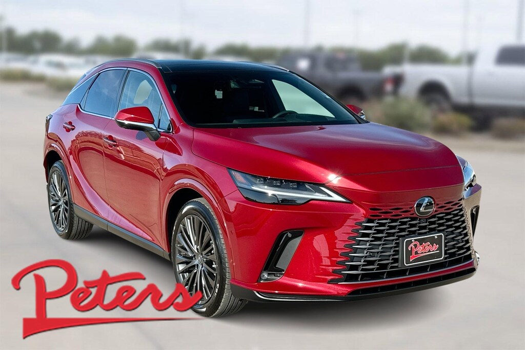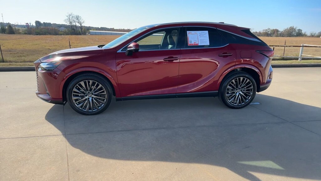 This 2023 Lexus RX 350 Luxury in Matador Red Mica comes with the following features: 2.4L I4 PDI Turbocharged DOHC 16V LEV3-SULEV30 275hp 8-Speed Automatic FWD Cold Area Package, Luxury Package (10-Way Power Driver & Fr Passenger Seat Adjusters, Finish Plate Door Inner Garnish, Head-Up Display (HUD), Multi-Color Illuminated Entry System, Parking Support Alert/Brake, Wireless Charger, and Wood Steering Wheel w/Paddle & Heater), ABS brakes, Active Cruise Control, Alloy wheels, Compass, Electronic Stability Control, Front dual zone A/C, Heated & Ventilated Front Bucket Seats, Heated door mirrors, Heated front seats, Illuminated entry, Low tire pressure warning, Power Liftgate, Power moonroof, Remote keyless entry, Traction control, 12 Speakers, 3.33 Axle Ratio, 4-Wheel Disc Brakes, Air Conditioning, AM/FM radio: SiriusXM, Anti-whiplash front head restraints, Auto High-beam Headlights, Auto tilt-away steering wheel, Auto-dimming door mirrors, Auto-dimming Rear-View mirror, Automatic temperature control, Brake assist, Bumpers: body-color, Delay-off headlights, Driver door bin, Driver vanity mirror, Dual front impact airbags, Dual front side impact airbags, Emergency communication system: Safety Connect (10-year trial), Exterior Parking Camera Rear, Four wheel independent suspension, Front anti-roll bar, Front Bucket Seats, Front Center Armrest, Front fog lights, Front reading lights, Fully automatic headlights, Garage door transmitter: HomeLink, Genuine wood console insert, Heads-Up Display, Heated steering wheel, Leather Shift Knob, Leather steering wheel, Memory seat, Navigation System, Occupant sensing airbag, Outside temperature display, Overhead airbag, Overhead console, Panic alarm, Passenger door bin, Passenger vanity mirror, Power door mirrors, Power driver seat, Power passenger seat, Power steering, Power windows, Radio data system, Radio: Lexus Interface w/14" HD Touchscreen Display, Rain sensing wipers, Rear air conditioning, Rear anti-roll bar, Rear reading lights, Rear seat center armrest, Rear side impact airbag, Rear window defroster, Rear window wiper, Roof rack: rails only, Security system, Semi-Aniline/Synthetic Suede Leather Seat Trim, Speed control, Speed-sensing steering, Split folding rear seat, Spoiler, Steering wheel memory, Steering wheel mounted audio controls, Tachometer, Telescoping steering wheel, Tilt steering wheel, Trip computer, Turn signal indicator mirrors, Variably intermittent wipers, Wheels: 21", and Wireless Apple CarPlay/Wireless Android Auto.