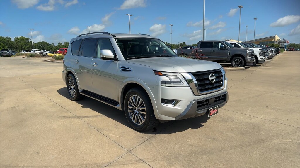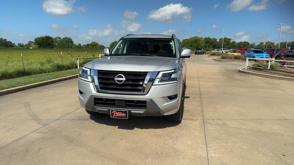 This 2023 Nissan Armada SL in Brilliant Silver Metallic comes with the following features: 5.6L V8 DOHC 32V LEV3-ULEV125 400hp 7-Speed Automatic RWD 13 Speakers, 2.94 Axle Ratio, 3rd Row Carpeted Floor Mats - Bench Seat, 3rd row seats: split-bench, 4-Wheel Disc Brakes, ABS brakes, Air Conditioning, Alloy wheels, AM/FM radio: SiriusXM, Anti-whiplash front head restraints, Auto High-beam Headlights, Auto tilt-away steering wheel, Auto-dimming door mirrors, Auto-dimming Rear-View mirror, Auto-leveling suspension, Automatic temperature control, Bose 13-Speaker Premium Audio System, Brake assist, Bumpers: body-color, Delay-off headlights, Driver door bin, Driver vanity mirror, Dual front impact airbags, Dual front side impact airbags, Electronic Stability Control, Emergency communication system: NissanConnect Services, Exterior Parking Camera Rear, Four wheel independent suspension, Front anti-roll bar, Front Bucket Seats, Front Center Armrest, Front dual zone A/C, Front fog lights, Front reading lights, Fully automatic headlights, Garage door transmitter: HomeLink, Heated door mirrors, Heated Front Bucket Seats, Heated front seats, Heated steering wheel, Illuminated entry, Knee airbag, Leather Shift Knob, Leather-Appointed Seat Trim, Low tire pressure warning, Memory seat, Navigation System, NissanConnect featuring Apple CarPlay and Android Auto, Occupant sensing airbag, Outside temperature display, Overhead airbag, Overhead console, Panic alarm, Passenger door bin, Passenger vanity mirror, Power door mirrors, Power driver seat, Power Liftgate, Power moonroof, Power passenger seat, Power steering, Power windows, Premium audio system: Bose, Radio: NissanConnect w/SiriusXM, Rear air conditioning, Rear anti-roll bar, Rear reading lights, Rear seat center armrest, Rear window defroster, Rear window wiper, Reclining 3rd row seat, Remote keyless entry, Security system, Speed control, Speed-sensing steering, Speed-Sensitive Wipers, Split folding rear seat, Spoiler, Steering wheel memory, Steering wheel mounted audio controls, Tachometer, Telescoping steering wheel, Tilt steering wheel, Traction control, Trip computer, Turn signal indicator mirrors, Variably intermittent wipers, Voltmeter, and Wheels: 20" x 8J Painted Alloy.