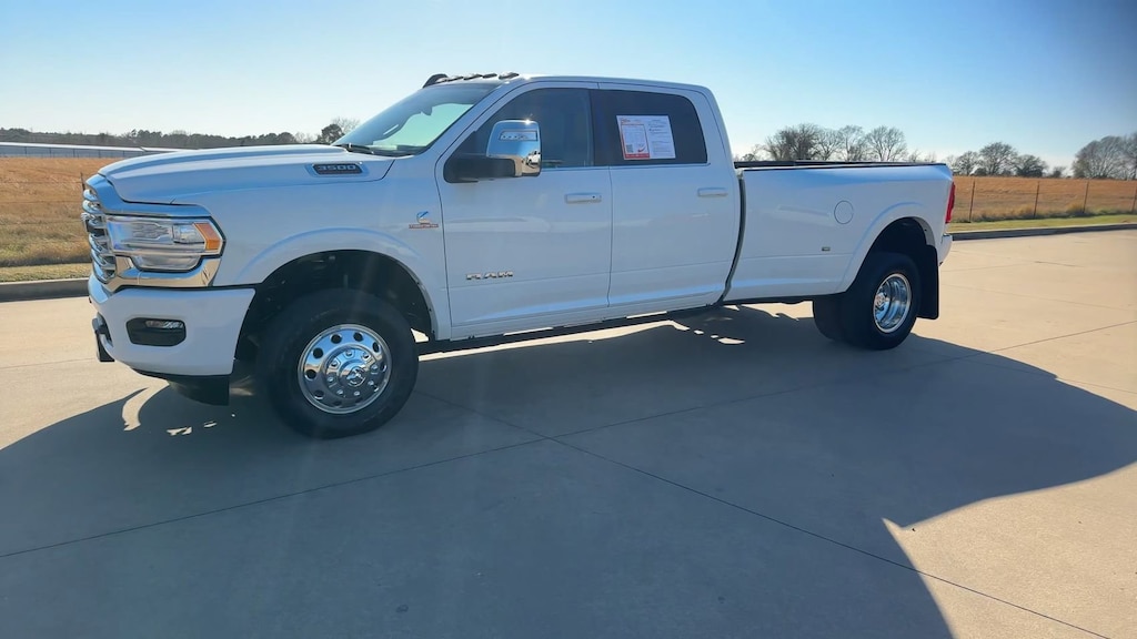 This 2024 Ram 3500 Laramie Longhorn in Bright White Clearcoat comes with the following features: 6.7L I6 Aisin 6-Speed Automatic 4WD Longhorn Level 1 Equipment Group (12" Touchscreen Display, 17 Speaker harman/kardon Premium Sound, 4G LTE Wi-Fi Hot Spot, Alexa Built-In, Apple CarPlay, Blind Spot & Cross Path Detection, Connected Travel & Traffic Services, Connectivity - US/Canada, Disassociated Touchscreen Display, For Details Visit DriveUconnect.com, For More Info, Call 800-643-2112, Global Telematics Box Module (TBM), Google Android Auto, GPS Antenna Input, GPS Navigation, HD Radio, Integrated Voice Command w/Bluetooth, LED Bed Lighting, MOPAR Spray In Bedliner, Off-Road Information Pages, Power Deployable Running Boards, Radio: Uconnect 5 Nav w/12.0" Display, Ramcharger Wireless Charging Pad, Selectable Tire Fill Alert, SiriusXM Radio Service, SiriusXM w/360L, and Trailer Tow Pages), Quick Order Package 21K Longhorn, 10 Speakers, 115V Auxiliary Rear Power Outlet, 2 Way Rear Headrest Seat, 220 Amp Alternator, 3.73 Axle Ratio, 4 Way Front Headrests, 4-Wheel Disc Brakes, 50 Gallon Fuel Tank, 5th Wheel/Gooseneck Towing Prep Group, 6000# Front Axle w/Hub Ext, ABS brakes, Active Noise Control System, Adjustable pedals, Air Conditioning, Alloy wheels, AM/FM radio: SiriusXM with 360L, Apple CarPlay/Android Auto, Audio memory, Auto High-beam Headlights, Auto-dimming door mirrors, Auto-dimming Rear-View mirror, Automatic temperature control, Box & Rear Fender Clearance Lamps, Brake assist, Bucket Seats, Bumpers: body-color, Center Hub, Clearance Lamps, Compass, Dash Pass Thru Wire Circuits, Delay-off headlights, Driver door bin, Driver vanity mirror, Dual front impact airbags, Dual front side impact airbags, Dual Rear Wheels, Electronic Stability Control, Electronically Controlled Throttle, Folding Flat Load Floor Storage, Front anti-roll bar, Front Bucket Seats, Front Center Armrest w/Storage, Front dual zone A/C, Front fog lights, Front License Plate Bracket, Front reading lights, Front Seat Back Map Pockets, Full Length Premium Upgraded Floor Console, Fully automatic headlights, Garage door transmitter, Genuine wood console insert, Genuine wood dashboard insert, Genuine wood door panel insert, Heated door mirrors, Heated Front Seats, Heated front seats, Heated rear seats, Heated Second Row Seats, Heated Steering Wheel, Heated steering wheel, High Back Seats, I/P Mounted Auxiliary Switches, Illuminated entry, Leather steering wheel, Low tire pressure warning, Manufacturer's Statement of Origin, Memory seat, MOPAR Deployable Bed Step, Navigation System, Occupant sensing airbag, Outside temperature display, Overhead airbag, Overhead console, Panic alarm, ParkView Rear Back-Up Camera, Passenger door bin, Passenger vanity mirror, Pedal memory, Power 8-Way Adjustable Passenger Seat, Power Adjust 8-Way Driver Seat, Power door mirrors, Power driver seat, Power passenger seat, Power steering, Power windows, Premium Filigree Leather Seats, Radio data system, Rain sensing wipers, Rear 60/40 Folding Seat, Rear reading lights, Rear seat center armrest, Rear step bumper, Rear window defroster, Remote keyless entry, Security system, Speed control, Split folding rear seat, Steering wheel mounted audio controls, Tachometer, Tilt steering wheel, Tip Start, Traction control, Trip computer, Turn signal indicator mirrors, Variably intermittent wipers, Ventilated Front Seats, Ventilated front seats, Voltmeter, Wheels: 17" x 6.0" Polished Aluminum, and Wheels: 18" x 8.0" Diamond Cut Face AluminuM.