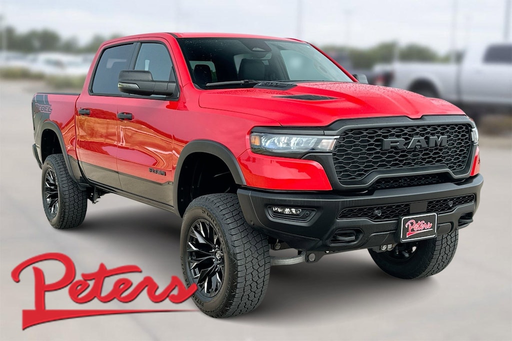 This 2025 Ram 1500 Rebel in Flame Red Clearcoat comes with the following features: 3.0L I6 8-Speed Automatic 4WD Quick Order Package 21W Rebel, 1500 Rebel, 4D Crew Cab, 3.0L I6, 8-Speed Automatic, 4WD, Flame Red Clearcoat, Red/Black Cloth, GPS Navigation, Navigation System, ParkView Rear Back-Up Camera, Radio: Uconnect 5 Nav w/12.0" Display, SiriusXM w/360L, 10 Speakers, 3.92 Rear Axle Ratio, 4 Way Front Headrests, 4-Wheel Disc Brakes, 4G LTE Wi-Fi Hot Spot, ABS brakes, Air Conditioning, Alloy wheels, AM/FM radio: SiriusXM with 360L, Apple CarPlay, Apple CarPlay/Android Auto, Auto High-beam Headlights, Auto-dimming Rear-View mirror, Automatic temperature control, Brake assist, Bucket Seats, Cloth/Vinyl Bucket Seats, Compass, Connected Travel & Traffic Services, Connectivity - US/Canada, Convex Wide-Angle Exterior Mirror Insert, Delay-off headlights, Driver door bin, Driver vanity mirror, Dual front impact airbags, Dual front side impact airbags, Electronic Stability Control, Exterior Mirrors w/Heating Element, Front anti-roll bar, Front Bucket Seats, Front Center Armrest w/Storage, Front dual zone A/C, Front fog lights, Front reading lights, Front Seat Back Map Pockets, Front wheel independent suspension, Full Length Upgraded Floor Console, Fully automatic headlights, Garage door transmitter, Google Android Auto, GPS Antenna Input, Heated door mirrors, Heated front seats, Heated steering wheel, Illuminated entry, Integrated Voice Command w/Bluetooth, Leather steering wheel, Low tire pressure warning, Manual Folding Exterior Mirrors, Occupant sensing airbag, Outside temperature display, Overhead airbag, Overhead console, Panic alarm, Passenger door bin, Passenger vanity mirror, Power Adjust 8-Way Driver Seat, Power door mirrors, Power driver seat, Power steering, Power windows, Radio data system, Rear 60/40 Folding Seat, Rear anti-roll bar, Rear seat center armrest, Rear step bumper, Remote keyless entry, Speed control, Split folding rear seat, Steering wheel mounted audio controls, Tachometer, Telescoping steering wheel, Tilt steering wheel, Traction control, Trip computer, USB Host Flip, Variably intermittent wipers, Voltmeter, and Wheels: 18" x 8.0" Painted Mid-Gloss Black.