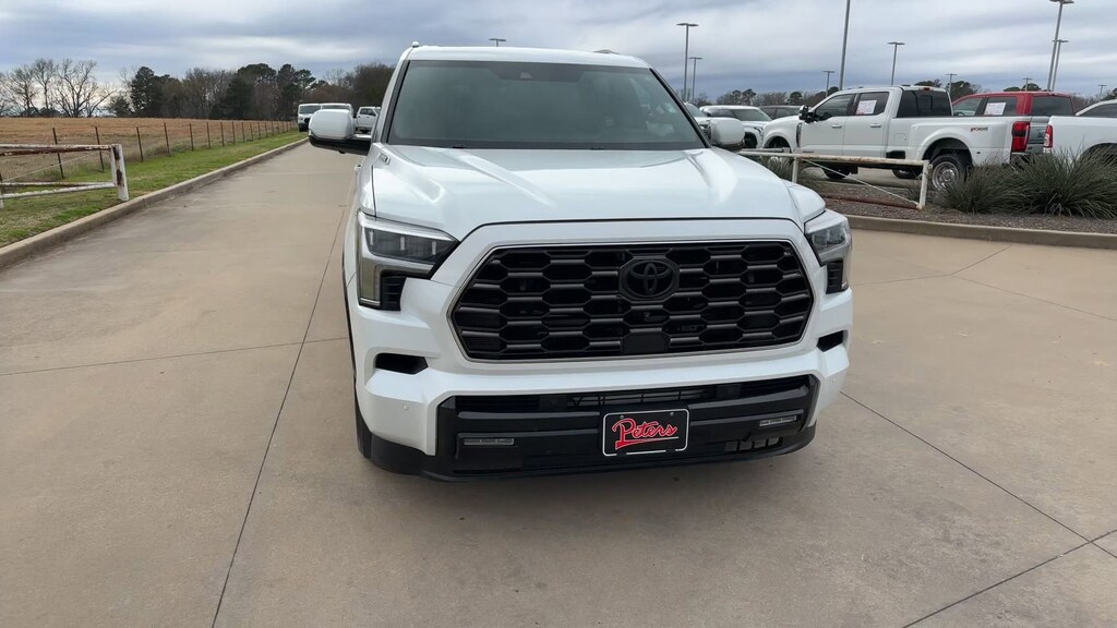 This 2024 Toyota Sequoia Platinum in White comes with the following features: V6 Hybrid 10-Speed Automatic 4WD ABS brakes, Active Cruise Control, Alloy wheels, Compass, Electronic Stability Control, Front dual zone A/C, Heated & Ventilated Front Seats, Heated door mirrors, Heated front seats, Heated rear seats, Illuminated entry, Leather Seat Trim, Low tire pressure warning, Power Liftgate, Power moonroof, Remote keyless entry, Traction control, 14 Speakers, 3.31 Axle Ratio, 3rd row seats: split-bench, 4-Wheel Disc Brakes, Air Conditioning, AM/FM radio: SiriusXM, Anti-whiplash front head restraints, Apple CarPlay/Android Auto, Auto High-beam Headlights, Auto tilt-away steering wheel, Auto-dimming door mirrors, Auto-dimming Rear-View mirror, Automatic temperature control, Brake assist, Bumpers: body-color, Cast Aluminum Step & Step Cover, Delay-off headlights, Driver door bin, Driver vanity mirror, Dual front impact airbags, Dual front side impact airbags, Emergency communication system: Safety Connect (10-year trial), Exterior Parking Camera Rear, Front anti-roll bar, Front Bucket Seats, Front Center Armrest w/Storage, Front fog lights, Front reading lights, Front wheel independent suspension, Fully automatic headlights, Garage door transmitter: HomeLink, Headlight cleaning, Heated steering wheel, Knee airbag, Leather steering wheel, Memory seat, Navigation system: Drive Connect (1 year trial) includes Cloud Navigation with real time traffic and Google POI, Occupant sensing airbag, Outside temperature display, Overhead airbag, Overhead console, Panic alarm, Passenger door bin, Passenger vanity mirror, Power door mirrors, Power driver seat, Power passenger seat, Power steering, Power windows, Premium audio system: JBL, Radio: JBL Premium Audio System, Rain sensing wipers, Rear air conditioning, Rear reading lights, Rear seat center armrest, Rear window defroster, Rear window wiper, Reclining 3rd row seat, Security system, Speed control, Speed-sensing steering, Split folding rear seat, Spoiler, Steering wheel mounted audio controls, Tachometer, Telescoping steering wheel, Tilt steering wheel, Trip computer, Turn signal indicator mirrors, Variably intermittent wipers, Ventilated front seats, Ventilated rear seats, Voltmeter, and Wheels: 20" Machined-Finish Black Alloy.