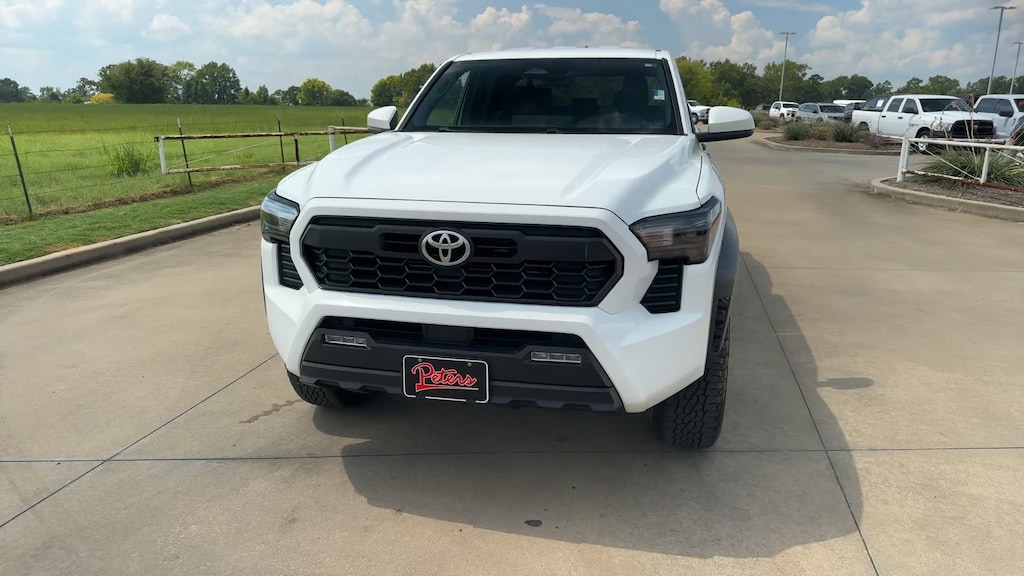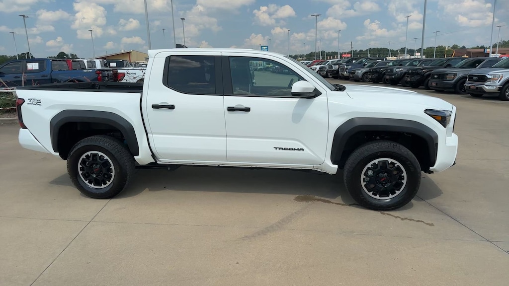 This 2024 Toyota Tacoma TRD Off-Road in White comes with the following features: 2.4L 4-Cylinder 8-Speed Automatic 4WD 4WD, ABS brakes, Alloy wheels, Electronic Stability Control, Heated door mirrors, Illuminated entry, Low tire pressure warning, Remote keyless entry, Traction control, 3.583 Axle Ratio, 4-Wheel Disc Brakes, 6 Speakers, Air Conditioning, AM/FM radio: SiriusXM, Anti-whiplash front head restraints, Apple CarPlay/Android Auto, Auto High-beam Headlights, Auto-dimming Rear-View mirror, Automatic temperature control, Brake assist, Bumpers: body-color, Driver door bin, Driver vanity mirror, Dual front impact airbags, Dual front side impact airbags, Emergency communication system: Safety Connect (1-year trial), Exterior Parking Camera Rear, Fabric Seat Trim (FD), Four wheel independent suspension, Front anti-roll bar, Front Bucket Seats, Front Center Armrest, Front fog lights, Front reading lights, Fully automatic headlights, Knee airbag, Leather Shift Knob, Leather steering wheel, Occupant sensing airbag, Outside temperature display, Overhead airbag, Overhead console, Panic alarm, Passenger door bin, Passenger vanity mirror, Power door mirrors, Power steering, Power windows, Radio: 8" Toyota Audio Multimedia, Rear step bumper, Rear window defroster, Security system, Speed control, Speed-sensing steering, Split folding rear seat, Steering wheel mounted audio controls, Tachometer, Telescoping steering wheel, Tilt steering wheel, Trip computer, Turn signal indicator mirrors, Variably intermittent wipers, and Wheels: 17" TRD Off-Road Alloy.