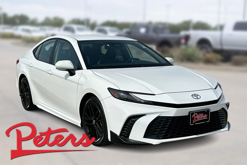 This 2025 Toyota Camry SE in White comes with the following features: 2.5L 4-Cylinder 16V DOHC eCVT FWD 4-Wheel Disc Brakes, 6 Speakers, ABS brakes, Air Conditioning, Alloy wheels, AM/FM radio: SiriusXM, Apple CarPlay/Android Auto, Auto High-beam Headlights, Automatic temperature control, Brake assist, Bumpers: body-color, Delay-off headlights, Driver door bin, Driver vanity mirror, Dual front impact airbags, Dual front side impact airbags, Electronic Stability Control, Emergency communication system: Safety Connect (up to 10-year trial subscription), Exterior Parking Camera Rear, Four wheel independent suspension, Front anti-roll bar, Front Bucket Seats, Front Center Armrest, Front dual zone A/C, Front reading lights, Fully automatic headlights, Heated door mirrors, Illuminated entry, Knee airbag, Leather Shift Knob, Leather steering wheel, Low tire pressure warning, Occupant sensing airbag, Outside temperature display, Overhead airbag, Overhead console, Panic alarm, Passenger door bin, Passenger vanity mirror, Power door mirrors, Power driver seat, Power steering, Power windows, Radio data system, Radio: Toyota Audio Multimedia w/12.3" Touchscreen, Radio: Toyota Audio Multimedia w/8" Touchscreen, Rear anti-roll bar, Rear reading lights, Rear seat center armrest, Rear side impact airbag, Rear window defroster, Remote keyless entry, Security system, SofTex & Fabric Seat Trim, Speed control, Speed-sensing steering, Split folding rear seat, Spoiler, Steering wheel mounted audio controls, Telescoping steering wheel, Tilt steering wheel, Traction control, Trip computer, Turn signal indicator mirrors, Variably intermittent wipers, and Wheels: 18" Black-Finished Alloy.
