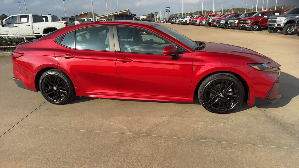 This 2025 Toyota Camry SE in Red comes with the following features: 2.5L 4-Cylinder 16V DOHC eCVT FWD ABS brakes, Active Cruise Control, Alloy wheels, Electronic Stability Control, Front dual zone A/C, Heated door mirrors, Illuminated entry, Low tire pressure warning, Remote keyless entry, Traction control, 4-Wheel Disc Brakes, 6 Speakers, Air Conditioning, AM/FM radio: SiriusXM, Apple CarPlay/Android Auto, Auto High-beam Headlights, Automatic temperature control, Brake assist, Bumpers: body-color, Delay-off headlights, Driver door bin, Driver vanity mirror, Dual front impact airbags, Dual front side impact airbags, Emergency communication system: Safety Connect (up to 10-year trial subscription), Exterior Parking Camera Rear, Four wheel independent suspension, Front anti-roll bar, Front Bucket Seats, Front Center Armrest, Front reading lights, Fully automatic headlights, Knee airbag, Leather Shift Knob, Leather steering wheel, Occupant sensing airbag, Outside temperature display, Overhead airbag, Overhead console, Panic alarm, Passenger door bin, Passenger vanity mirror, Power door mirrors, Power driver seat, Power steering, Power windows, Radio data system, Radio: Toyota Audio Multimedia w/8" Touchscreen, Rear anti-roll bar, Rear reading lights, Rear seat center armrest, Rear side impact airbag, Rear window defroster, Security system, SofTex & Fabric Seat Trim, Speed control, Speed-sensing steering, Split folding rear seat, Spoiler, Steering wheel mounted audio controls, Telescoping steering wheel, Tilt steering wheel, Trip computer, Turn signal indicator mirrors, Variably intermittent wipers, and Wheels: 18" Black-Finished Alloy.
