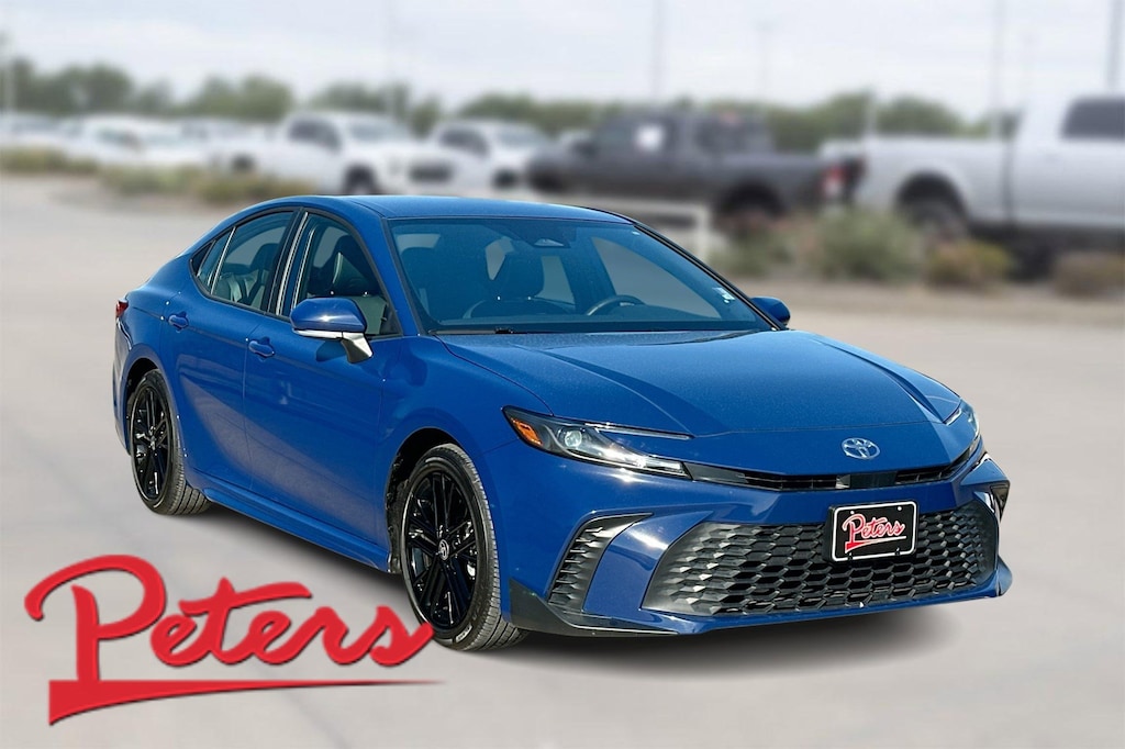 This 2025 Toyota Camry SE in Blue comes with the following features: 2.5L 4-Cylinder 16V DOHC eCVT FWD ABS brakes, Active Cruise Control, Alloy wheels, Electronic Stability Control, Front dual zone A/C, Heated door mirrors, Illuminated entry, Low tire pressure warning, Remote keyless entry, Traction control, 4-Wheel Disc Brakes, 6 Speakers, Air Conditioning, AM/FM radio: SiriusXM, Apple CarPlay/Android Auto, Auto High-beam Headlights, Automatic temperature control, Brake assist, Bumpers: body-color, Delay-off headlights, Driver door bin, Driver vanity mirror, Dual front impact airbags, Dual front side impact airbags, Emergency communication system: Safety Connect (up to 10-year trial subscription), Exterior Parking Camera Rear, Four wheel independent suspension, Front anti-roll bar, Front Bucket Seats, Front Center Armrest, Front reading lights, Fully automatic headlights, Knee airbag, Leather Shift Knob, Leather steering wheel, Occupant sensing airbag, Outside temperature display, Overhead airbag, Overhead console, Panic alarm, Passenger door bin, Passenger vanity mirror, Power door mirrors, Power driver seat, Power steering, Power windows, Radio data system, Radio: Toyota Audio Multimedia w/8" Touchscreen, Rear anti-roll bar, Rear reading lights, Rear seat center armrest, Rear side impact airbag, Rear window defroster, Security system, SofTex & Fabric Seat Trim, Speed control, Speed-sensing steering, Split folding rear seat, Spoiler, Steering wheel mounted audio controls, Telescoping steering wheel, Tilt steering wheel, Trip computer, Turn signal indicator mirrors, Variably intermittent wipers, and Wheels: 18" Black-Finished Alloy.